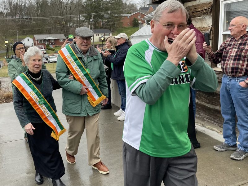 O’Flaherty led the parade, playing the harmonica. “Everyone is welcome, and whoever shows up participates. We’ve had Irish wolfhounds, dancers, and cloggers over the years. It’s not organized. We just show up and have fun!”
