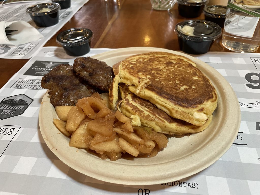 The menu consisted of pancakes (buckwheat & regular), sausage, country ham, apples, maple syrup, chocolate gravy, and drinks.