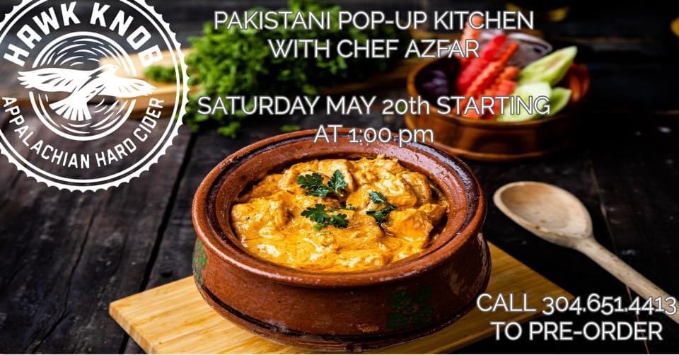 Visit Azfar this Saturday, May 20, from 12:30pm until he sells out. The pop-up kitchen is being held at Hawk Knob Appalachian Hard Cider’s beautiful property west of Lewisburg.