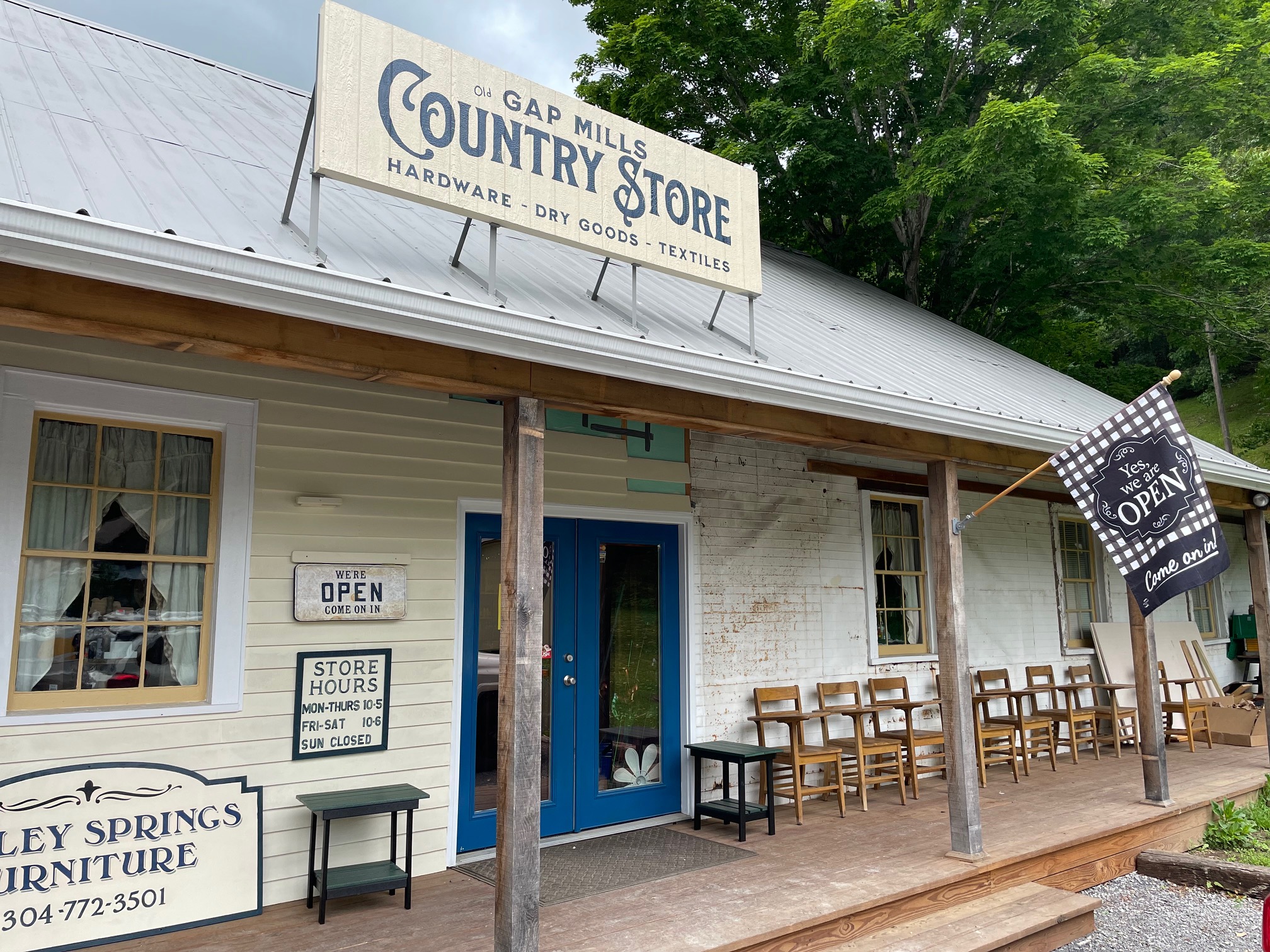 The Old Gap Mills Country Store is located at 8869 Sweet Springs Valley Road in Gap Mills. They are open Monday-Thursday from 10am-5pm and Friday-Saturday from 10am-6pm. They are closed on Sundays. You can reach them at 304-772-4178 or via Facebook.