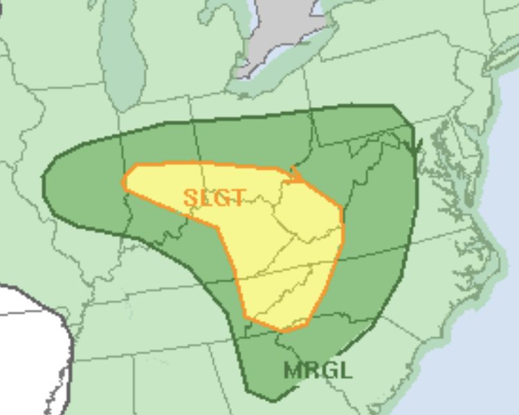 Day1 Severe thunderstorms producing damaging winds and hail are possible across a region from Illinois into Kentucky on Thursday. A couple tornadoes may also occur. West Virginia not affected day 1.