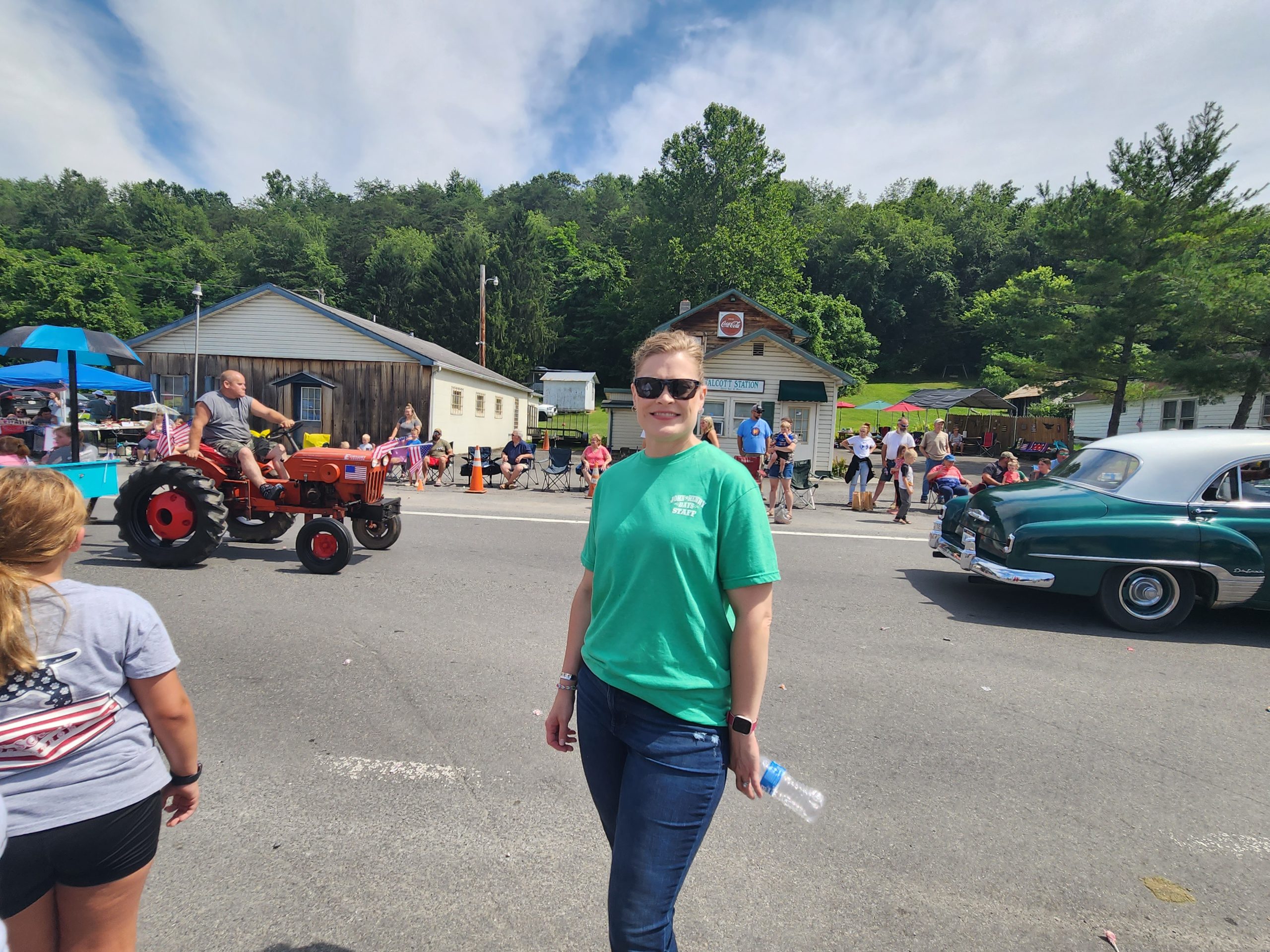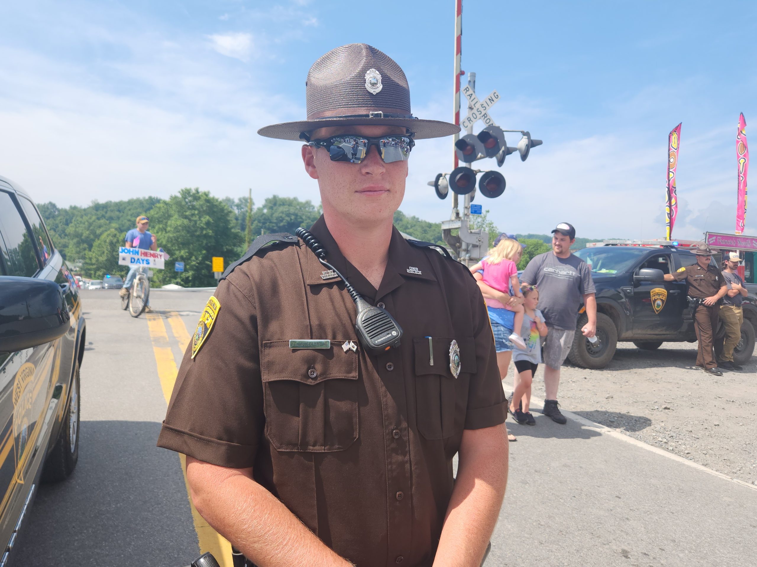 Stacy Ford, the Circuit Clerk of Summers County, stood nearby Linda Huffman, helping to greet people and guide them across the railroad tracks to find good vantage points from which to watch the Saturday morning parade. Like Huffman, Ford passionately expressed the importance of John Henry Days for the culture and to the economy of Talcott. She pointed to a West Virginia DNR (Division of Natural Resources) vehicle leading the parade, and she pointed specifically to the driver, DNR officer J.C. Wheeler.