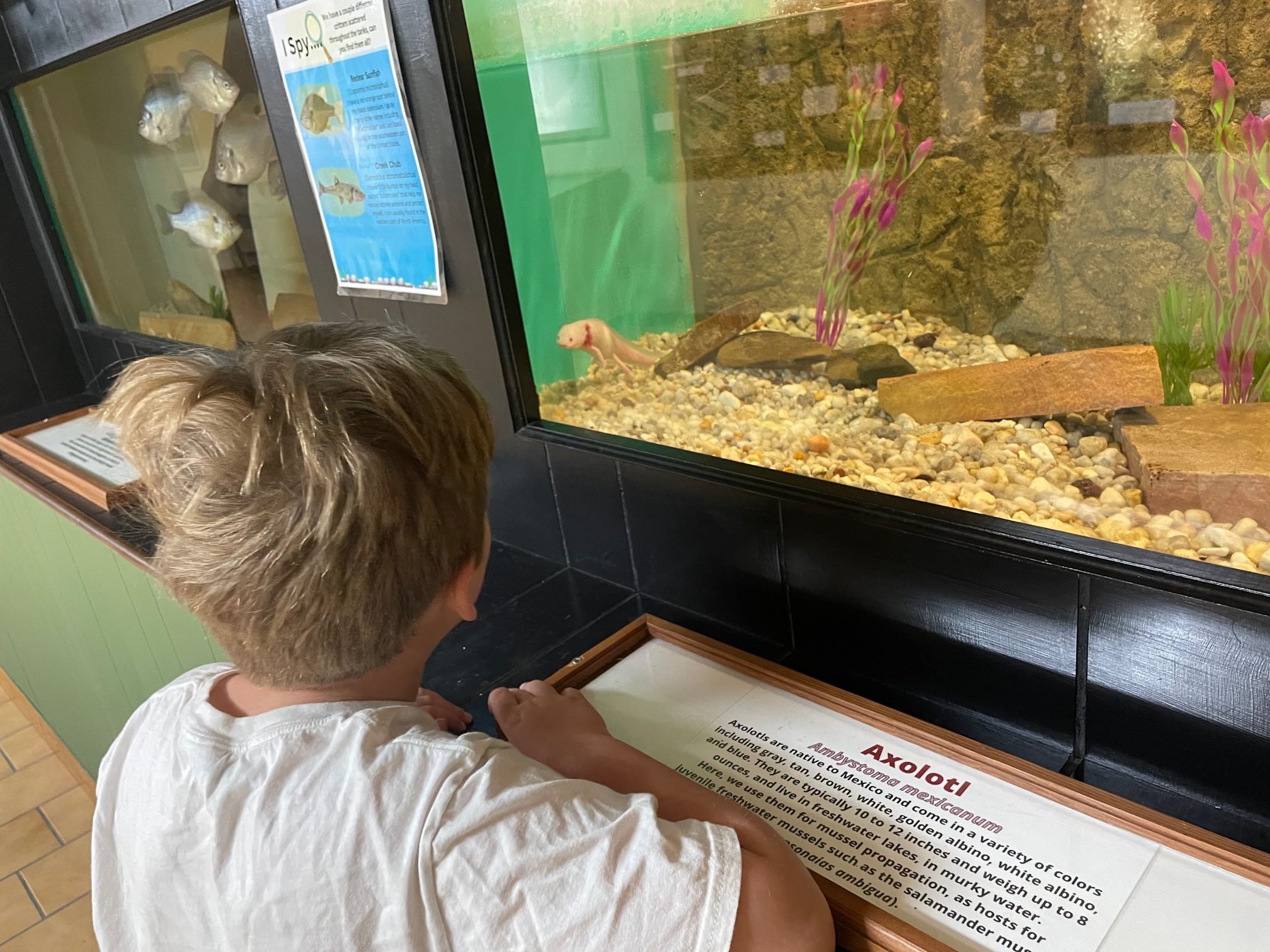 You can imagine my surprise when we visited the White Sulphur Springs National Fish Hatchery (operated by the US Fish & Wildlife Service) last week…where they have an actual axolotl in an educational display.