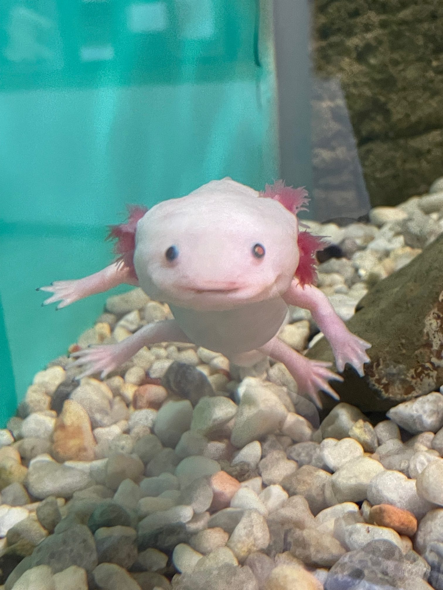Staff at the fish hatchery explained to us that although they have become popular pets, they are very difficult to care for. They don’t see well, and they require very specific water conditions which are hard to regulate at home by people who are not professionals. If axolotls are not properly cared for, their gills will fall off.