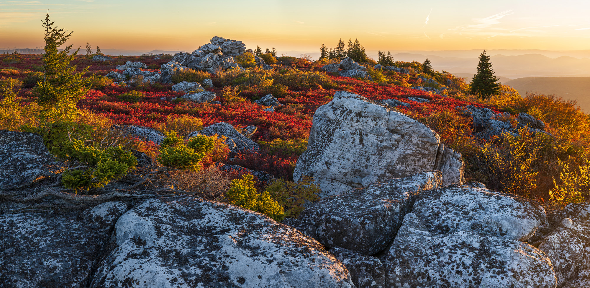 This image showcases Dolly Sods just as the rising sun illuminates the Autumn landscape.