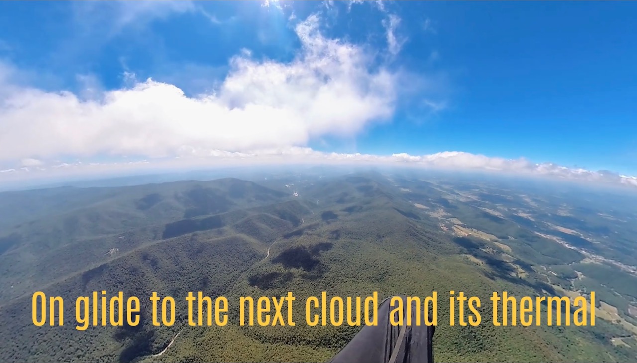 “The second type of lift is thermic,” he tells me. “Hot air rises from the earth and forms cumulus clouds, so as long as you fly under them you have a pretty good chance of finding a thermal. You can also watch the birds and follow them. They show you the way to the thermal.”