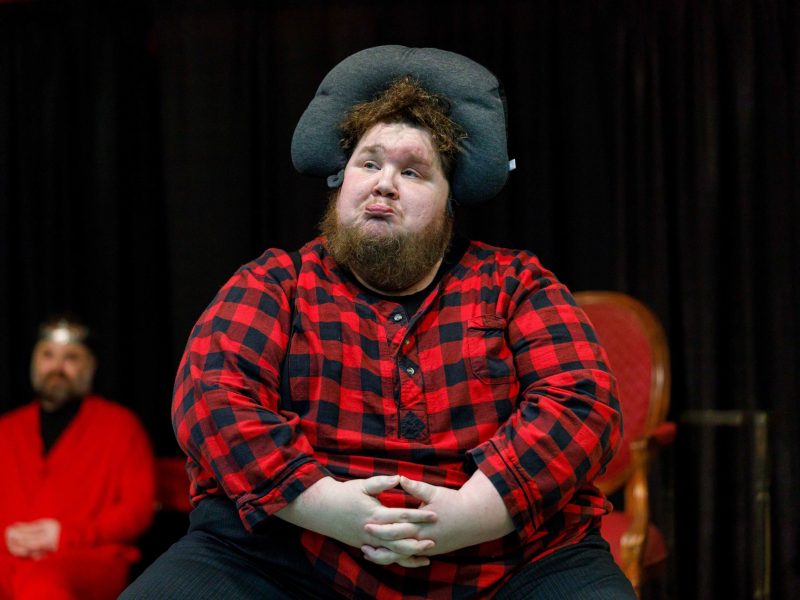 As the hot-blooded Hotspur, Justin Grow provided a perfect foil to Hal’s cavalier cool. He dominated every scene he was in with his barely controlled rage born of political grievance. His inevitable sword fight with Hal in the final act was the turning point for the future king. Hal is one of Shakespeare’s favorite characters, and from the time Sarah Young appears on stage with her cheek bloodied from war, Hal is beginning to grow into his future robes. He learns less about life from his real father, though, than he learns from his drinking buddy, Sir John Falstaff.