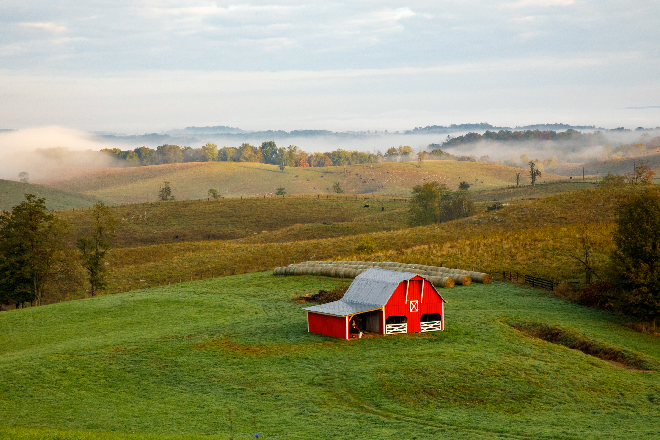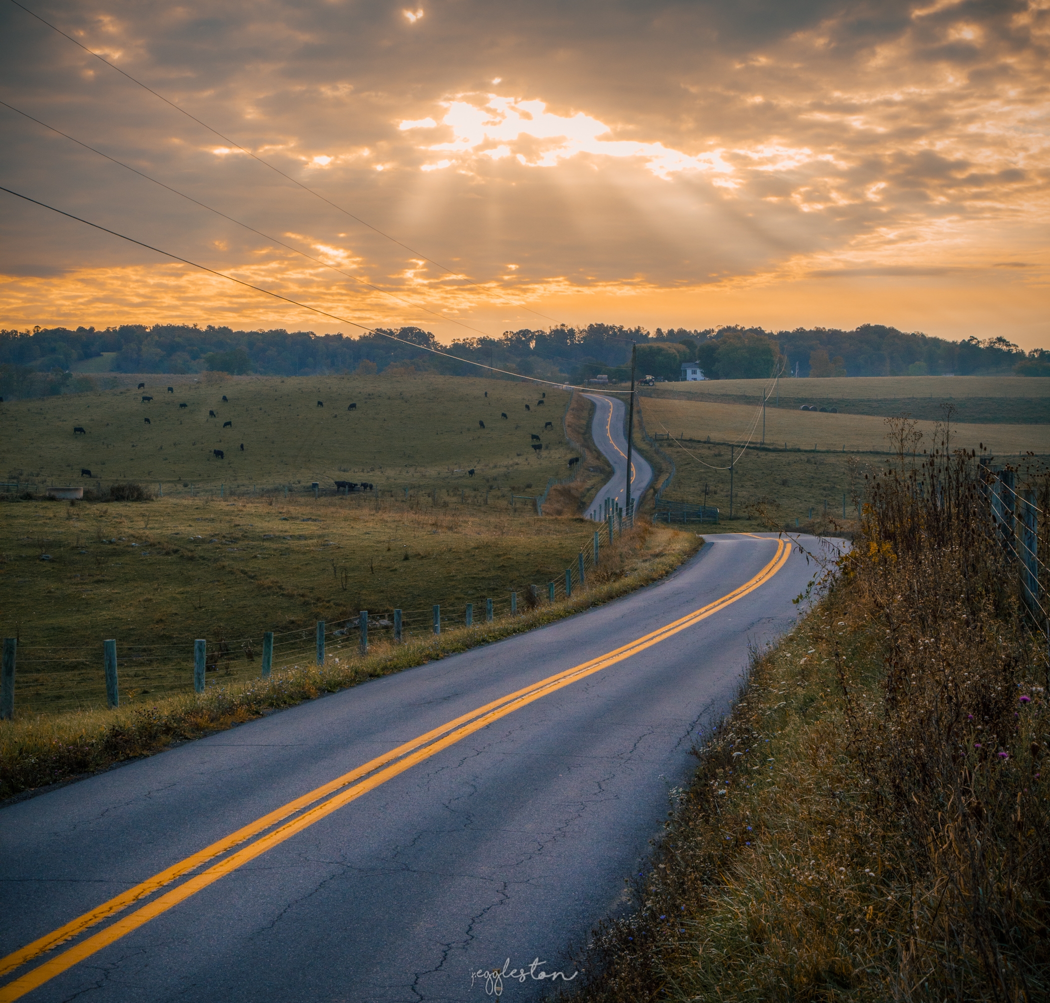 Driving home after work, I found a few scenes that truly stood out. One image features the road I live on, Hillsdale Rd. in Sinks Grove. The rays from the sun were breaking through the clouds, perfectly highlighting my home and I wanted to share it. Also featured is a little red barn being illuminated by the rising sun with the last few remaining signs of summer displayed by the little blue flowers.