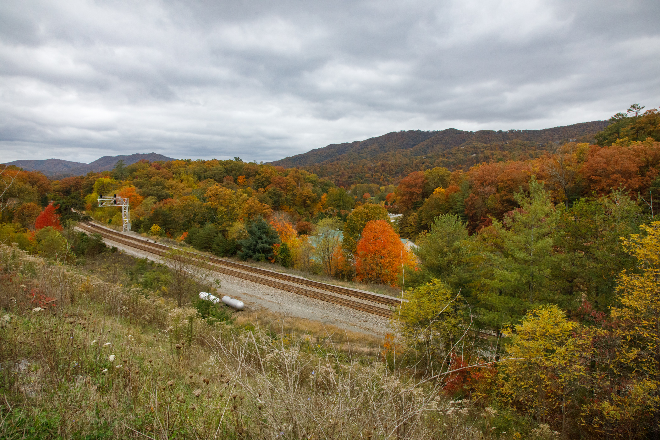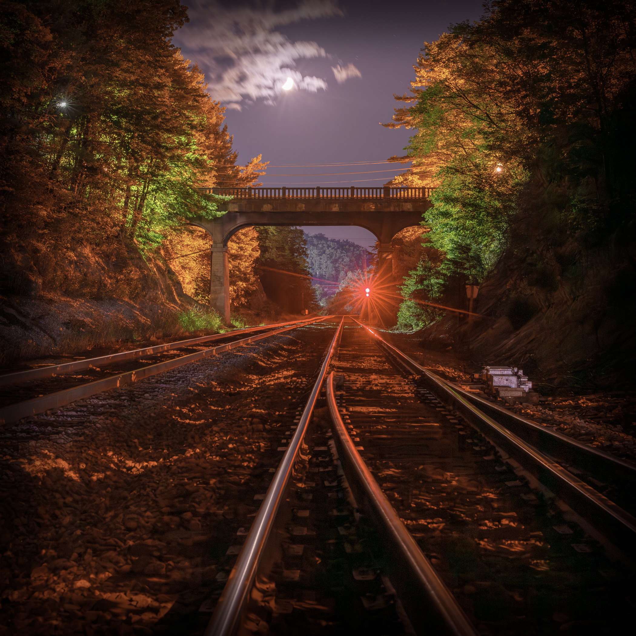 Continuing my journey, I ventured to the Greenbrier Hotels’, Sports Performance Center, where I captured the train tracks leading into the Appalachian Mountains, their slopes vibrant with fall color. After it got dark I noticed the street light was illuminating the same train tracks from the bridge above. I ventured below and captured a stunning nightscape Autumn image that highlights the saying, “Right place, right time”.