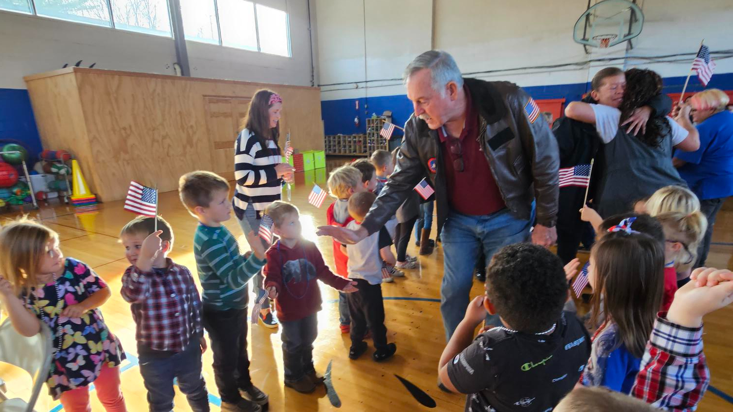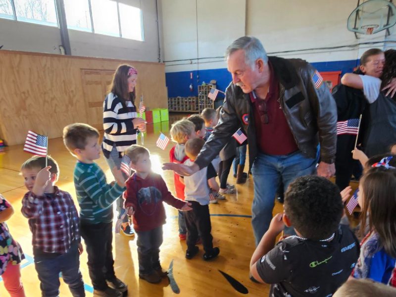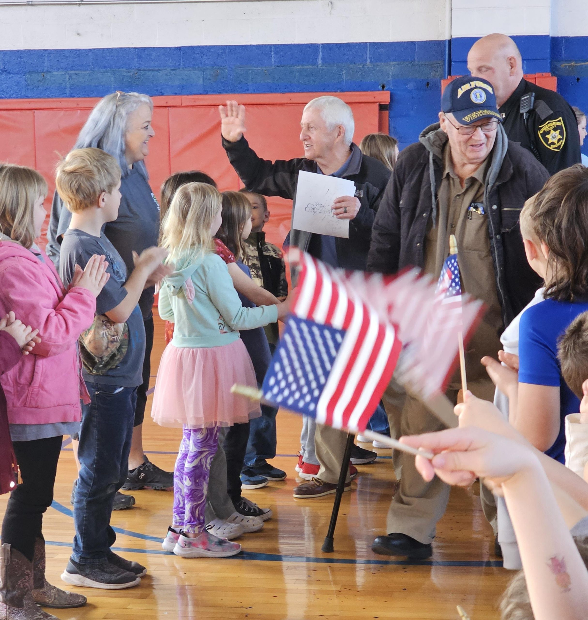 The school cooks prepared a full breakfast for veterans in the community and invited by students. Following the meal, the students lined the entry to the gymnasium. They waved flags, cheered for the veterans, and welcomed them to the program.