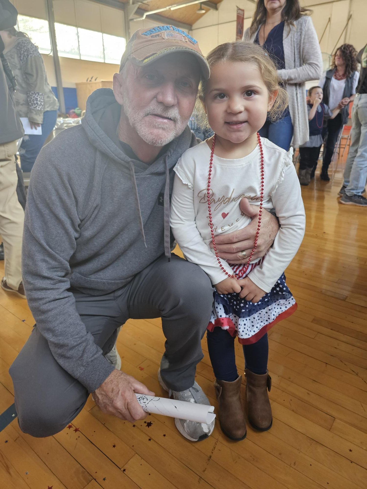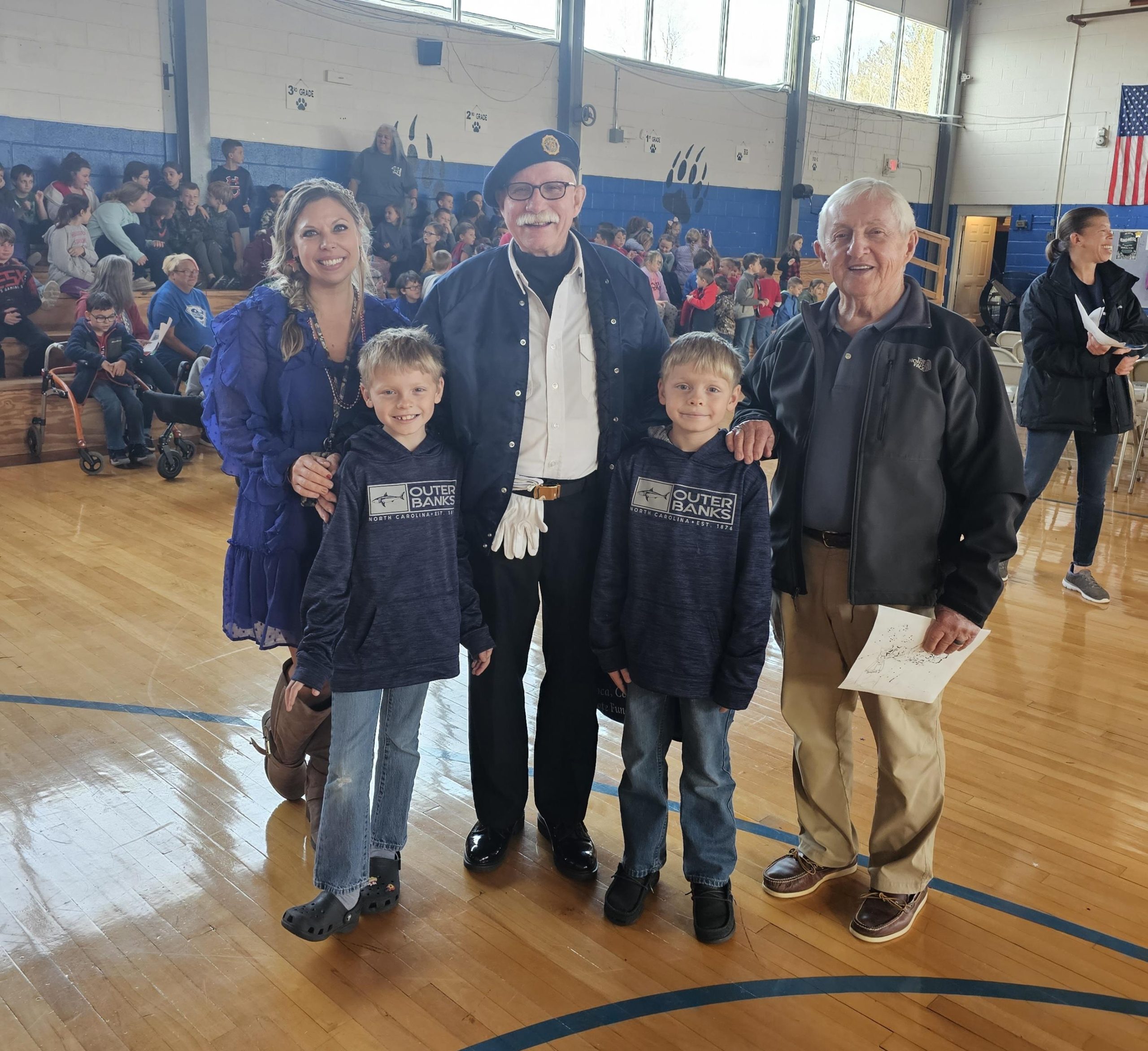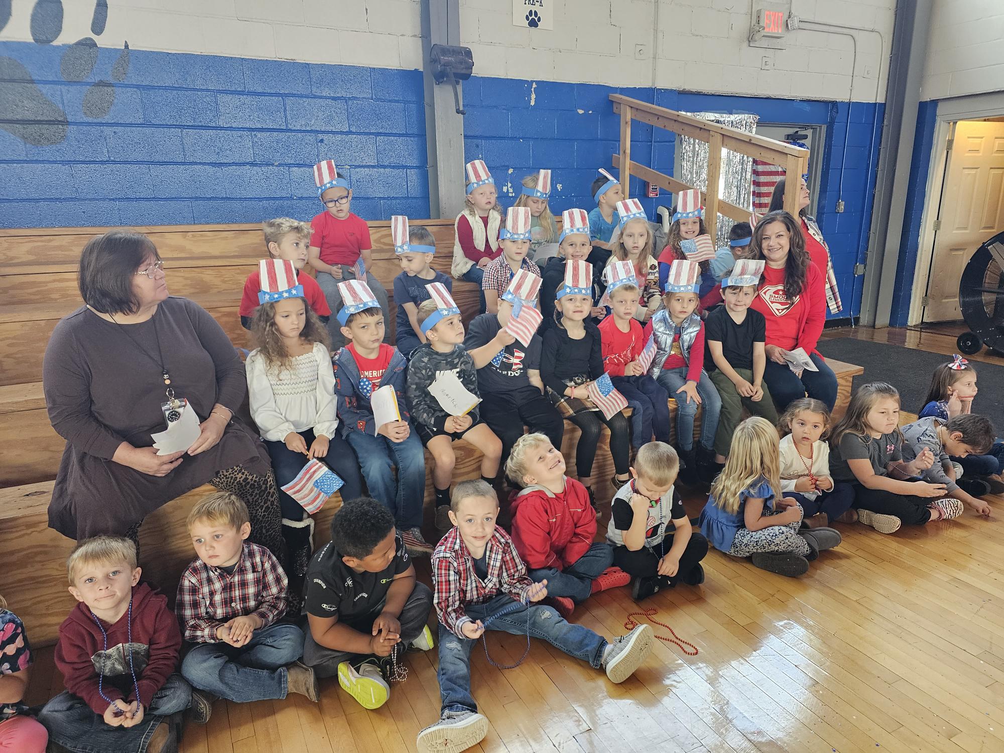 The school cooks prepared a full breakfast for veterans in the community and invited by students. Following the meal, the students lined the entry to the gymnasium. They waved flags, cheered for the veterans, and welcomed them to the program.