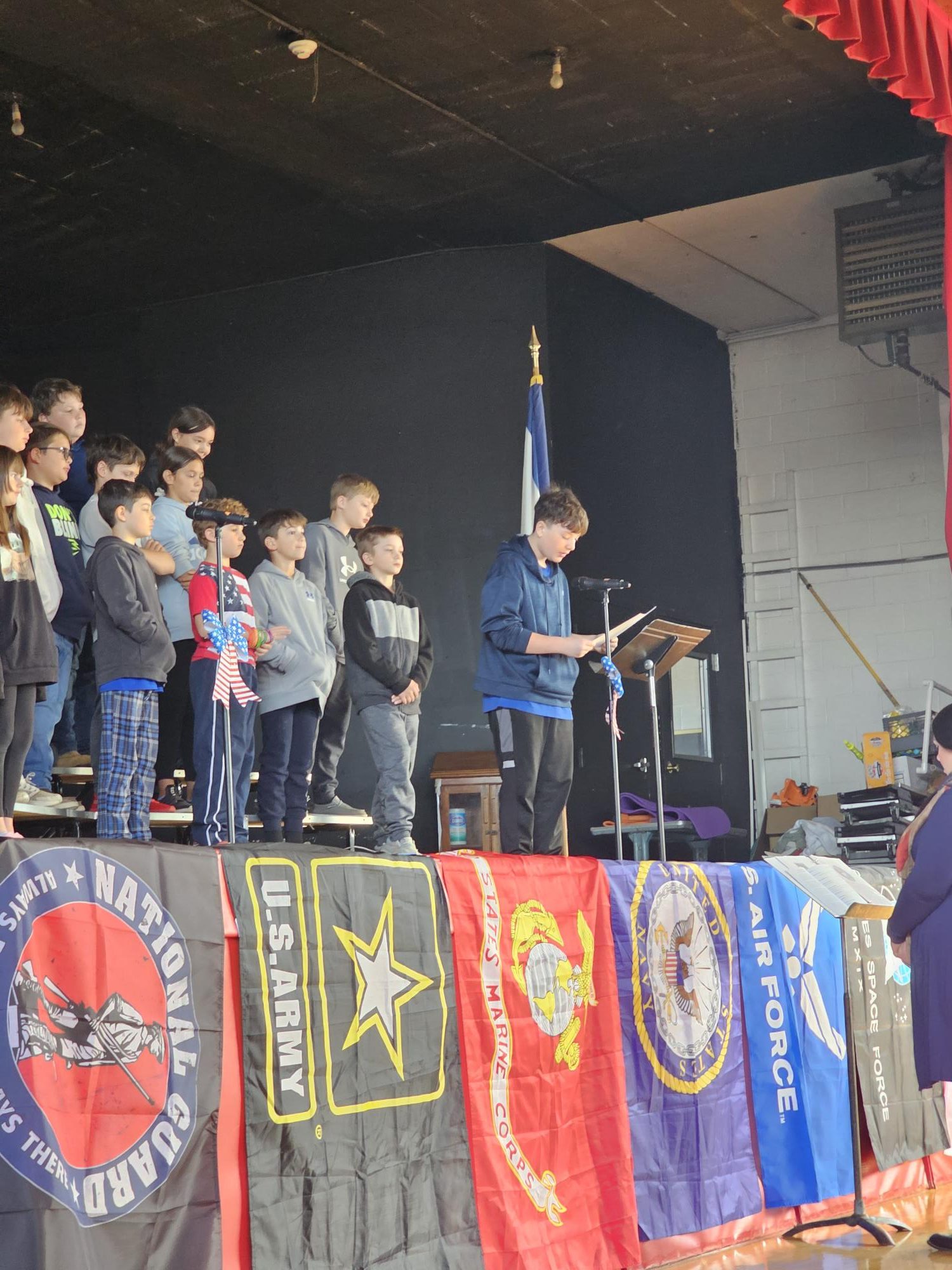 Under the direction of Ms. Boothe, the fifth grade students then several patriotic songs for their special guests.