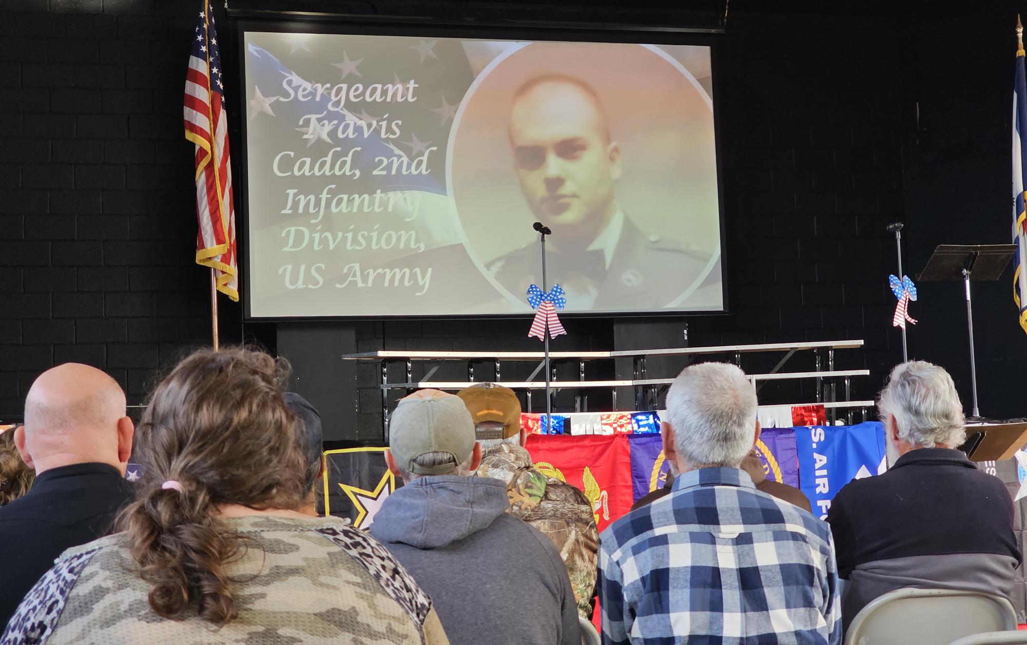 A slideshow played during the program featuring pictures submitted by students and community members of veterans from the Smoot area.