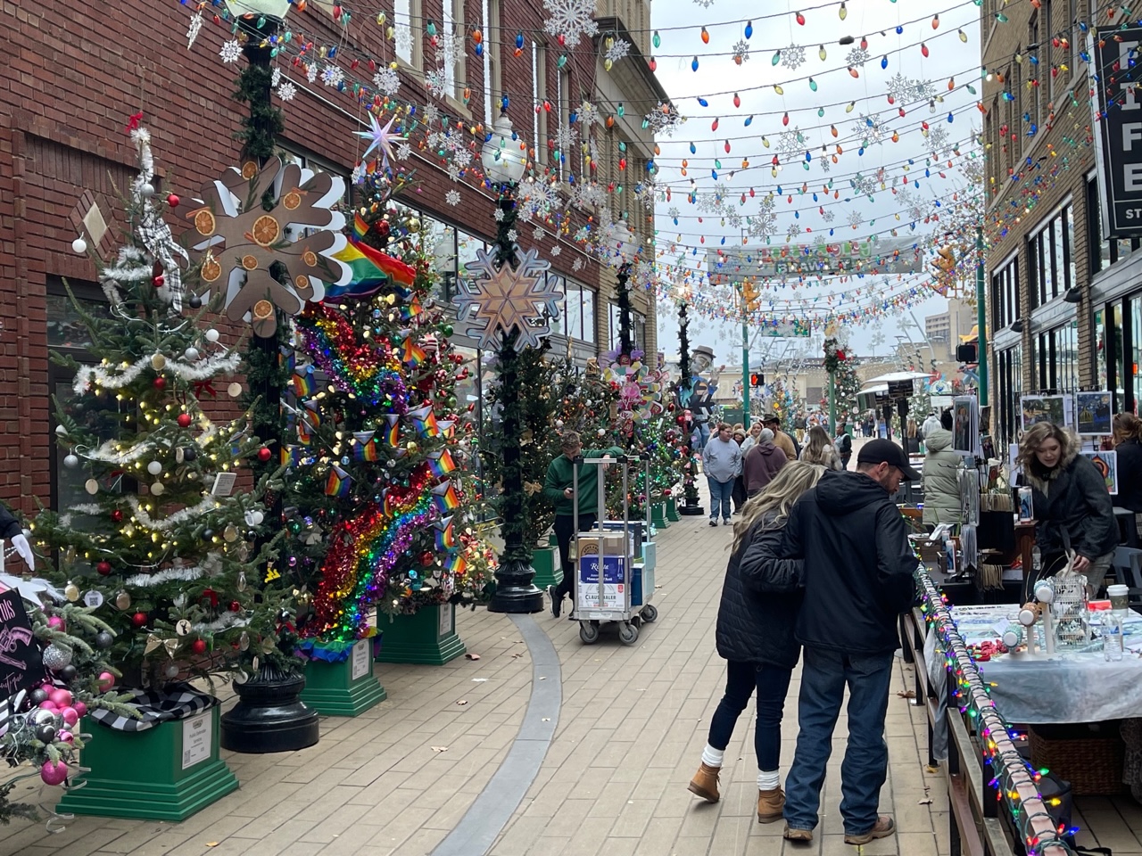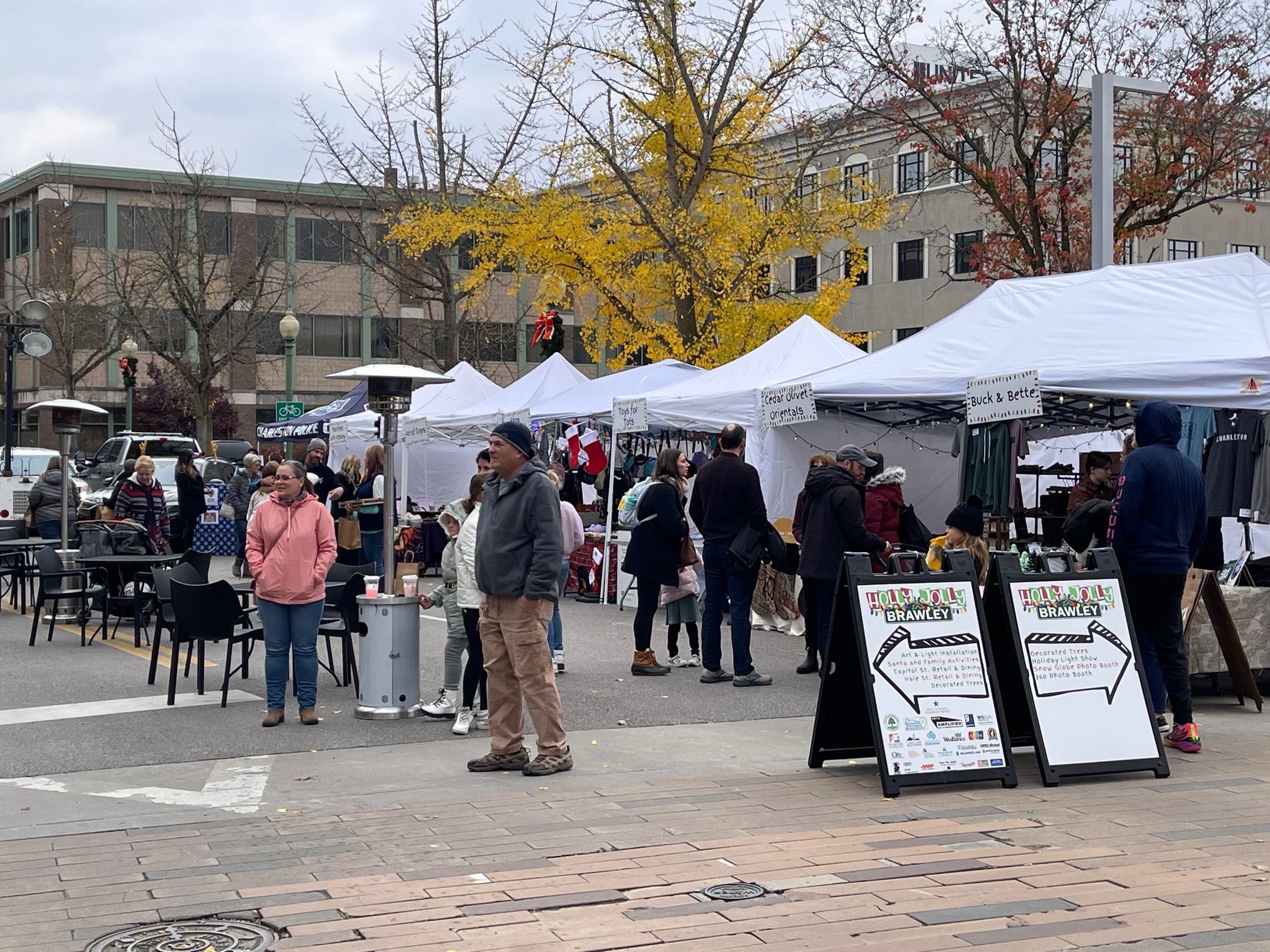For Small Business Saturday, the holiday Market opens at noon, with DJ EJ Price playing Christmas favorites until 3 p.m. BRRO will perform live at Slack Plaza at 4 p.m., followed by Shelem at 6. The Holly Jolly Brawley Light Show will begin at 7:15.