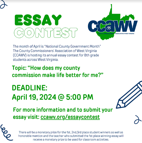 CHARLESTON, W.Va. — The County Commissioners’ Association of West Virginia (CCAWV) is proud to announce the launch of its annual essay contest in celebration of National County Government Month. As April unfolds, the CCAWV invites 8th-grade students from across West Virginia to participate in this educational initiative aimed at fostering a deeper understanding of county government and the vital role County Commissioners play in shaping communities.