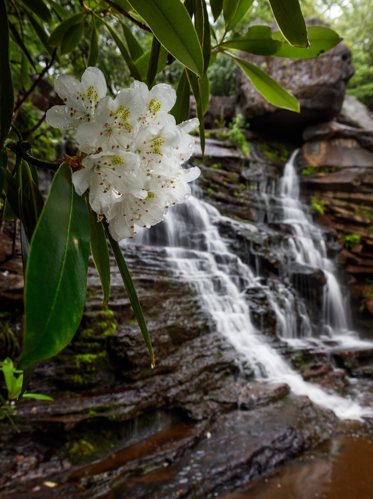 The rhododendron maximum as seen from Pendleton Falls in Blackwater Falls State Park. Image captured by WV Landscape Photographer David S. Johnston.