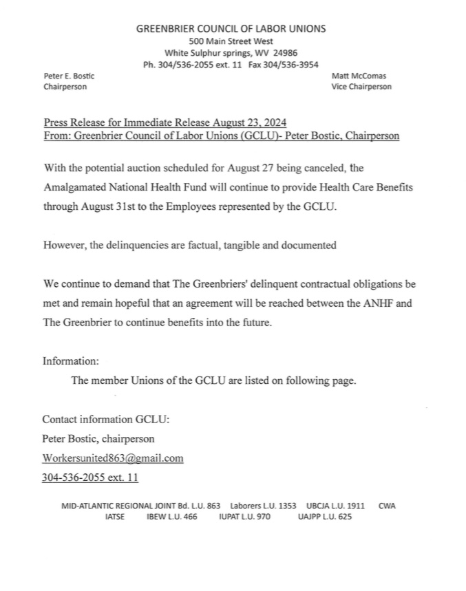 In a statement released this afternoon to RealWV, Peter Bostic (Chairperson of the Greenbrier Central Labor Unions) pushed back against that claim. He said that payments remain delinquent as they have been for months and employee health care premiums will end if payments are not made by the end of the month.