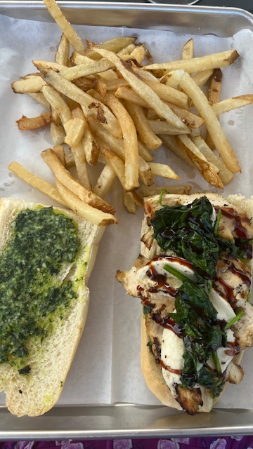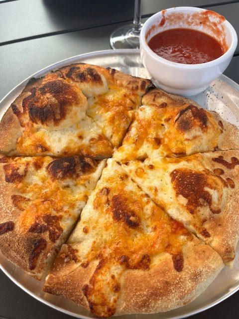 Max’s includes three dining areas–bar seating with a television, table seating inside, and table seating outside on the patio. All of the patio tables are under umbrellas, and more folks can sit outside than inside. An open garage door by the bar serves as the gateway between all the dining areas, with a large kitchen in the back.