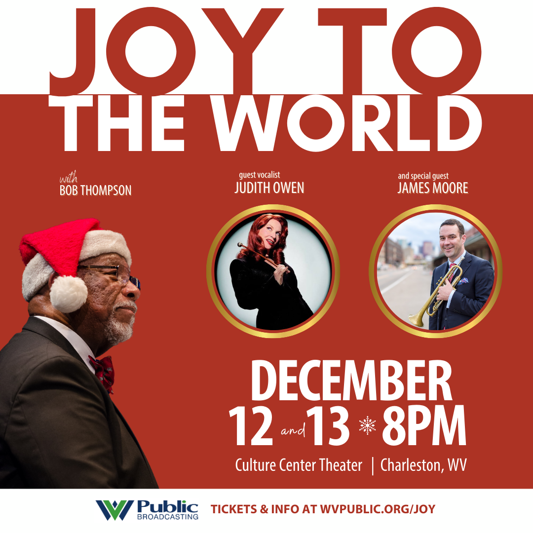 CHARLESTON, W.Va. – Bob Thompson’s annual holiday jazz celebration is back. For thirty-two years, Joy to the World has been delighting audiences on radio, television, and in person with old and new holiday favorites. The event is at the Culture Center Theater on Thursday, Dec. 12 and Friday, Dec. 13, and is presented by West Virginia Public Broadcasting. Doors will open at 7:30 p.m., and the show will begin at 8pm. All tickets are general admission and are available online at Eventbrite or at mountainstage.org.