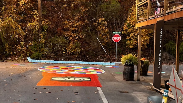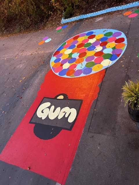In total, the project took about 10 hours over two days to complete. The gum ball machine street mural is located outside the studio by the stop sign on Dry Creek Road. The paint should last at least 3-4 years. While Penny says art isn’t made to be permanent, she and her team are prepared to freshen up the mural annually as needed.