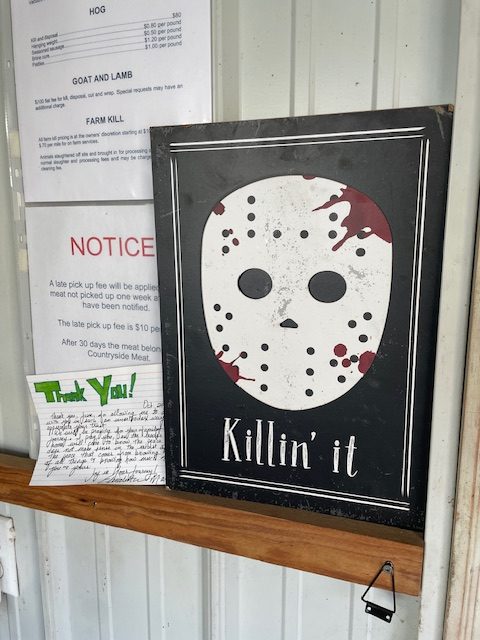 There’s a sign leading from the office to the processing floor. It makes the function of the slaughterhouse clear. Anna got it as a joke for Jesse, and it still makes him laugh.