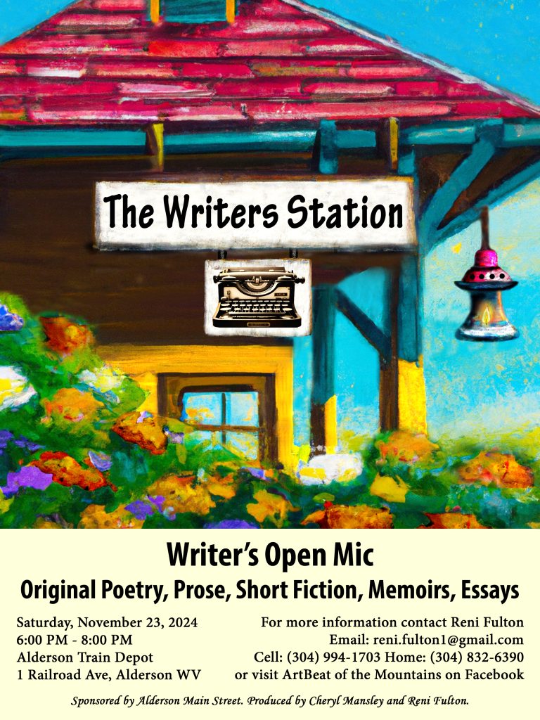 The Writers Station is sponsored by Alderson Main Street and produced by Cheryl Mansley and Reni Fulton. It will typically take place on the 4th Saturday of each month, except in December, when there will be no open mic. For more information, contact Reni Fulton at reni.fulton1@gmail.com, 304-994-1703 (cell), 304-832-6390 (landline), or visit ArtBeat of the Mountains on Facebook.