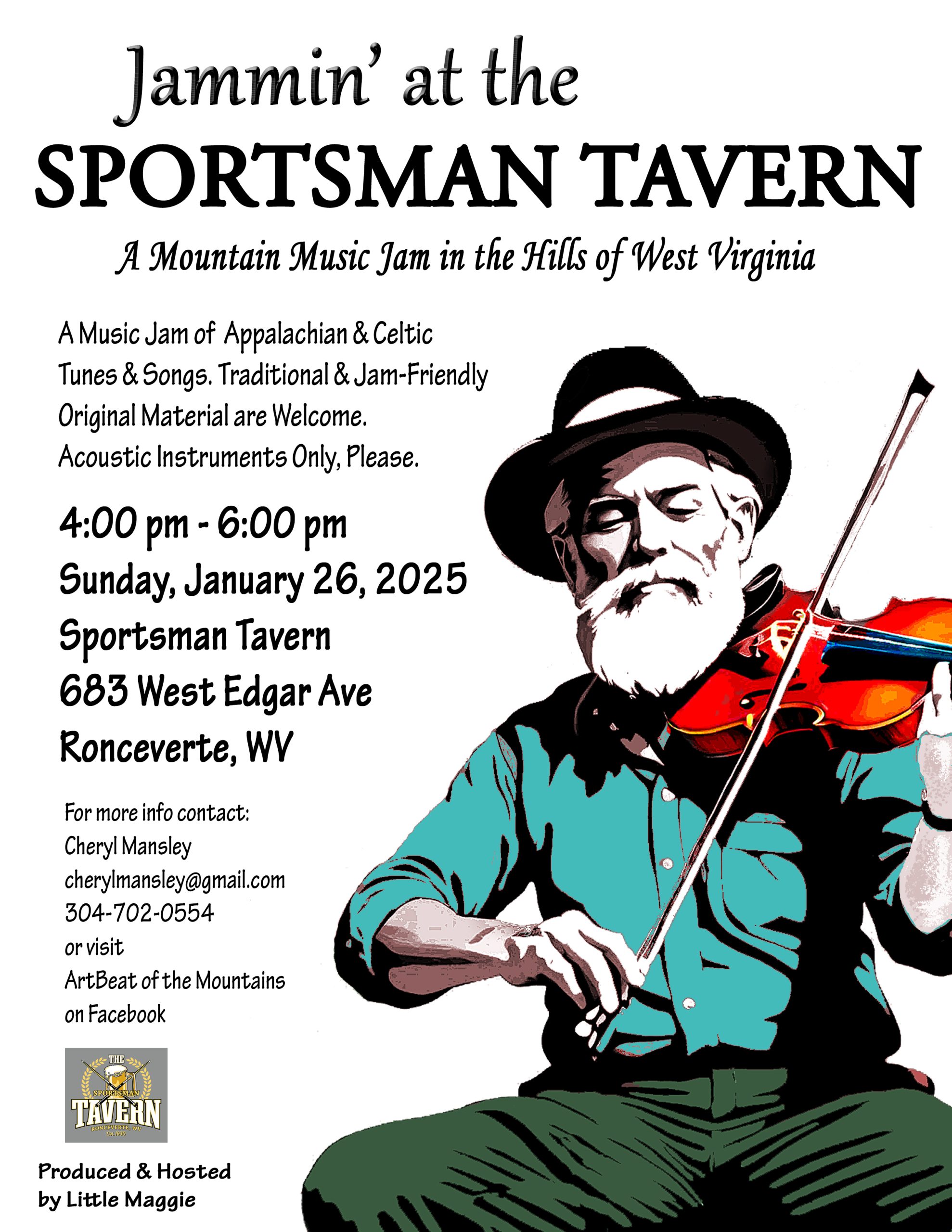 For more information about the jam, contact Cheryl Mansley at cherylmansley@gmail.com or 304-702-0554, or visit ArtBeat of the Mountains on Facebook.