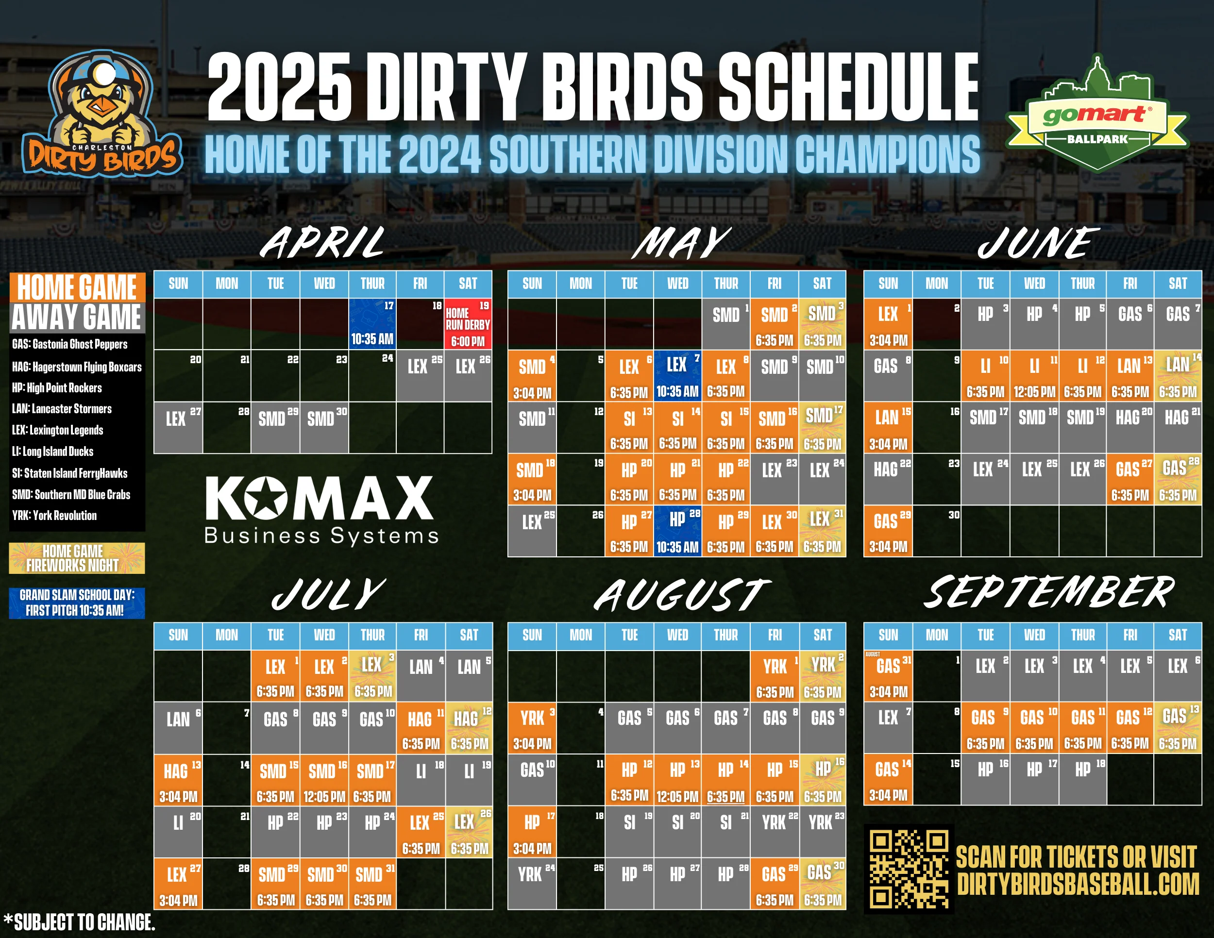 While the Dirty Birds will begin the regular season on Friday, April 25 against Lexington, they will once more welcome fans for their home opener seven-days later. The Dirty Birds will take on the Southern Maryland Blue Crabs at GoMart Ballpark on Friday, May 2. The first pitch is scheduled for 6:35 p.m.