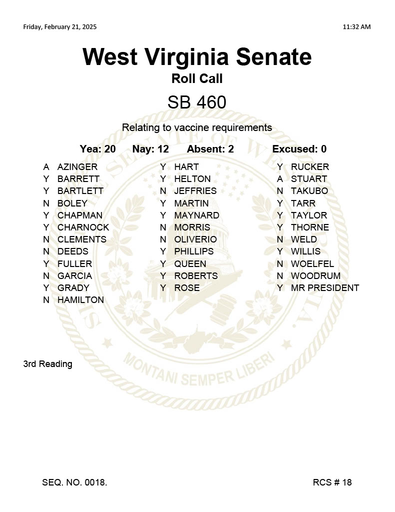 CHARLESTON, W.Va. – After a lengthy debate on Friday, the West Virginia Senate voted 20-12 to add three exemptions to the state’s mandatory childhood vaccination laws.