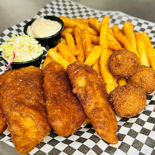 Fish & Chips, Coleslaw, Fries, and Hush Puppies $15.99