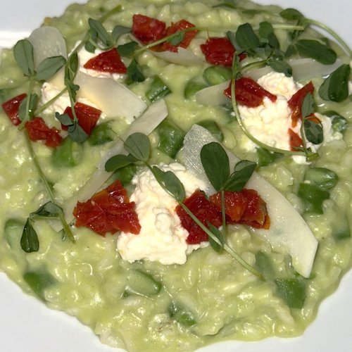 Main Course: Choice of Duck Leg Confit, Sugar Snap Pea Risotto (pictured), or French Goat Burger
