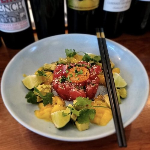 Tuna Tartar – chunks of delicious tuna tossed in a sesame ponzu sauce served with fresh mango and avocado; topped with a cured egg yolk and cream Sriracha $18
