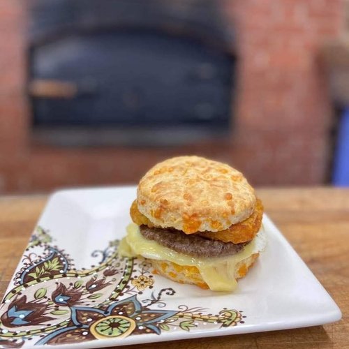 Homemade cheddar biscuit with sausage, egg, cheese, and a crispy hashbrown