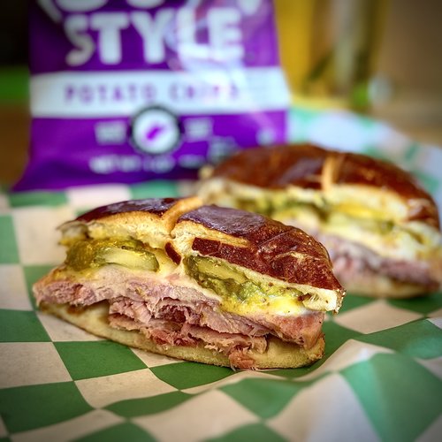 Colonel Jessup’s Cuban – Fried Old World German Bologna with spicy pickles, Bavarian mustard and Swiss cheese on a pretzel bun served with Mr. Bee chips and a pickle wedge $14