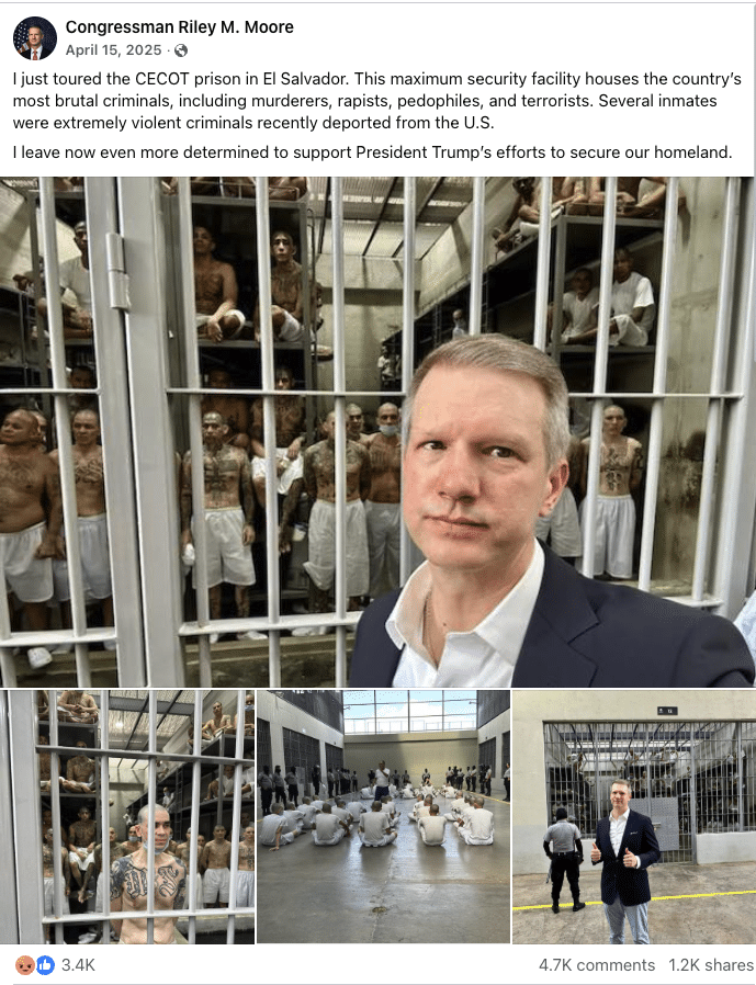 On April 15, U.S. Congressman Riley Moore, of West Virginia’s second district, posted an image of himself on social media touring CECOT prison in El Salvador – the mega-prison that is serving as the holding location for U.S. deportees as part of President Trump’s immigration crackdown. That photo of Congressman Moore, standing in front of a cell packed with deportees, has received major attention.