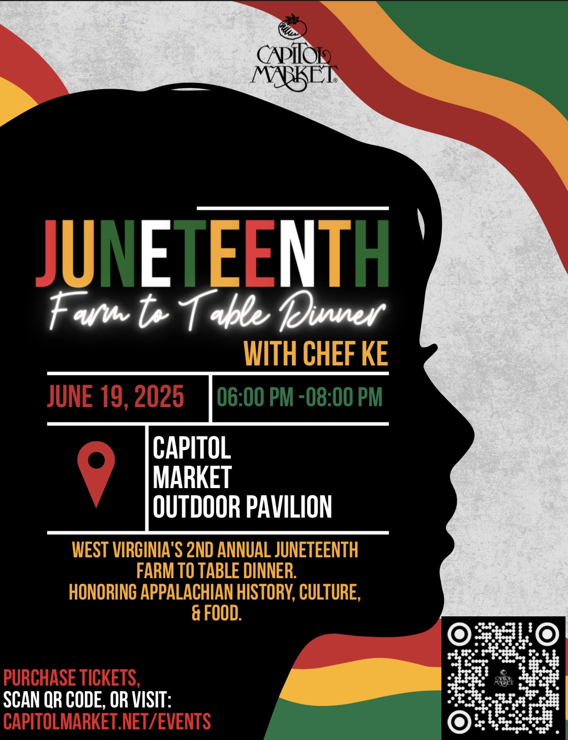 CHARLESTON, W.Va. – The Capitol Market’s second annual Juneteenth farm to table dinner will be held Thursday, from 6-8 p.m. The dinner spotlights African American Farmers and Businesses in and around the West Virginia and the Appalachian area. Live music will come from West Virginia’s 1st Lady of Soul Lady D, tunes by DJ EJ. Farmers including Dural Miller, Micah Colbert, Mear Mae Medows, James Jones, Micah Colbert and more. Each guest will receive a gift bag including West Virginia Black Owned products.