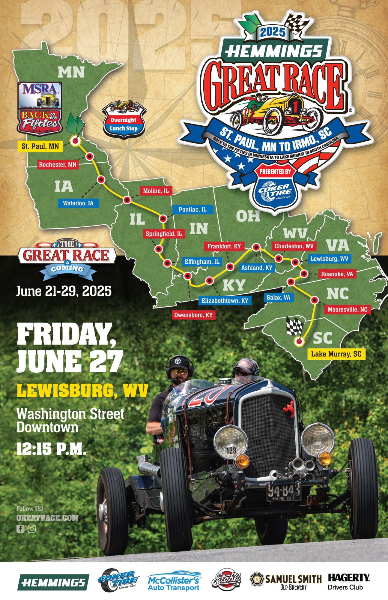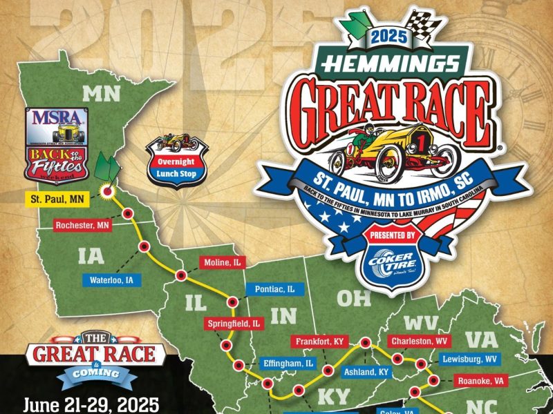 The 2025 Great Race will begin on Saturday, June 21, in St. Paul, Minnesota, surrounded by a crowd of thousands at the MSRA Back to the 50’s Weekend car show at the Minnesota State Fairgrounds. Nine days later, on Sunday, June 29, the race will finish in Irmo, South Carolina, near Lake Murray. Between the start and finish, cities are approximately 2,300 miles of competition, and 17 hosted city stops are in Minnesota, Iowa, Illinois, Kentucky, West Virginia, Virginia, North Carolina, and South Carolina.