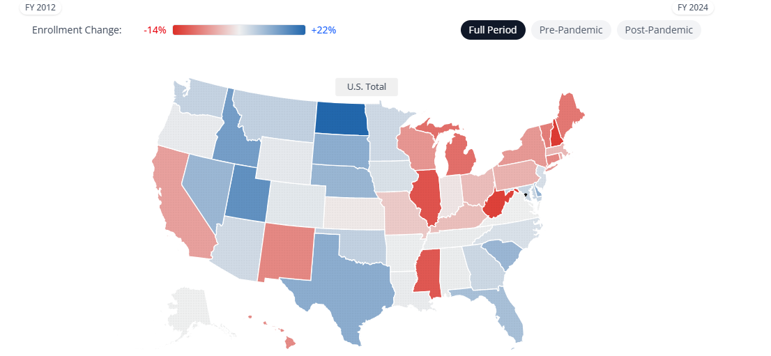 While public school enrollment remained flat in America from 2012-2024, it plummeted by nearly 13% in West Virginia. More than 36,000 students left the public school system during that time.