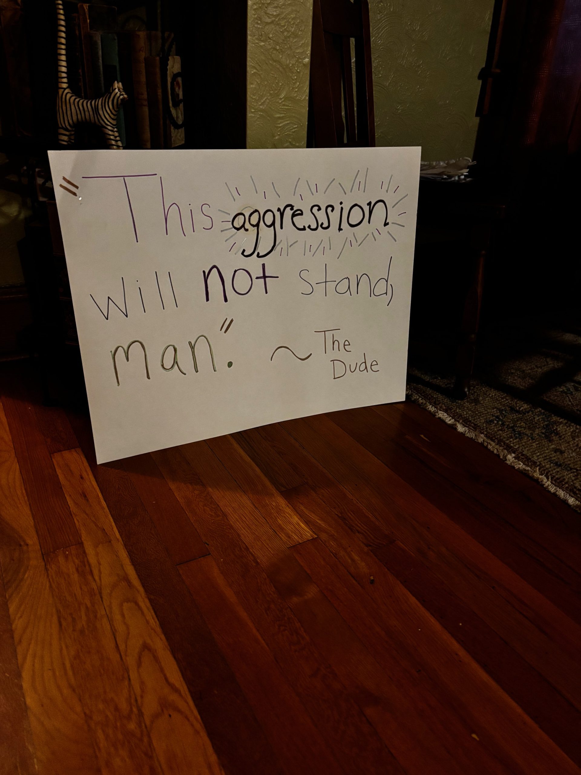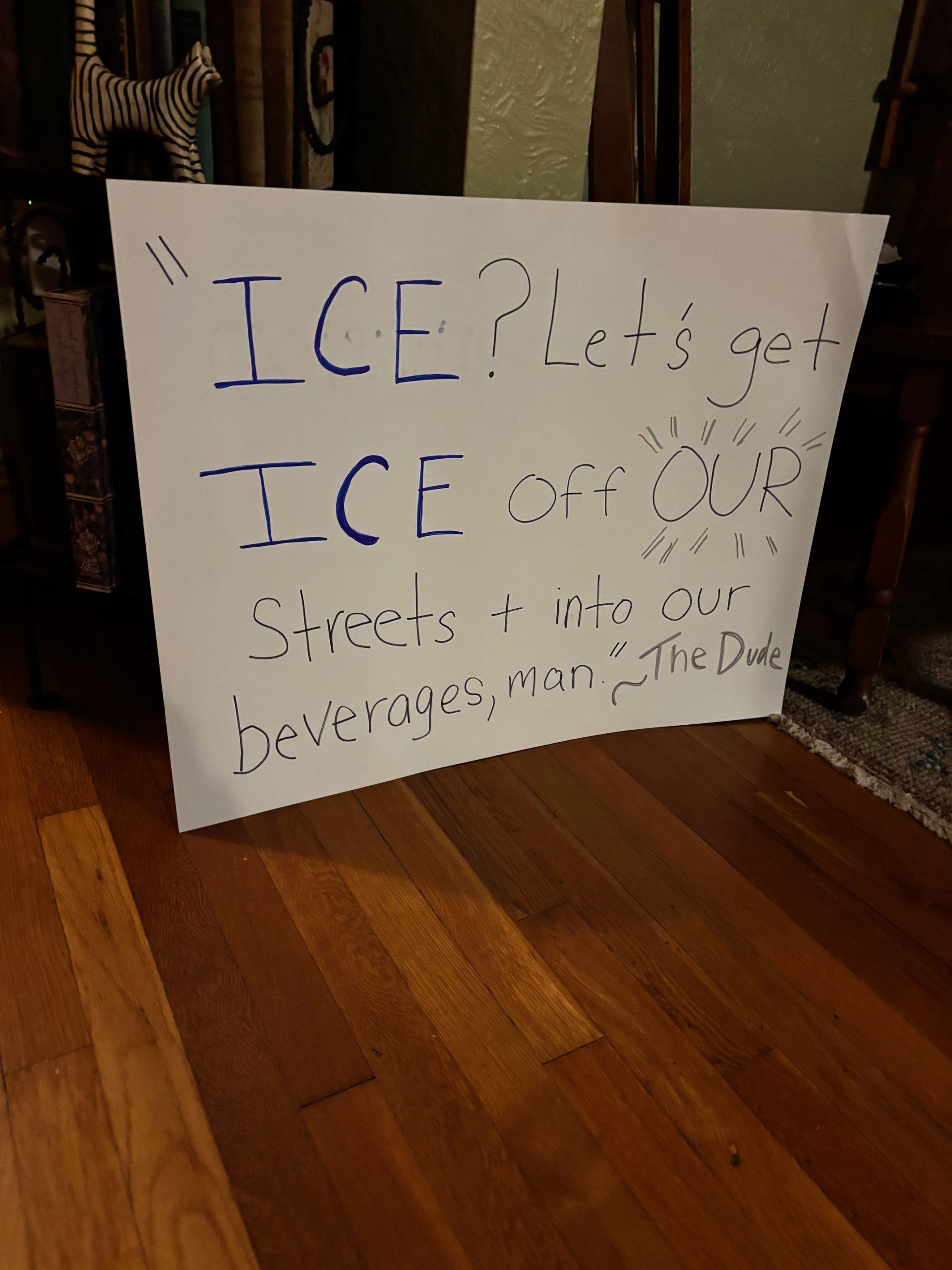 Sullivan’s homemade signs – one stating “This aggression will not stand, man,” and the other stating “ICE? Let’s get ICE off OUR streets and into our beverages, man” – were inspired by Jeff Bridges’ famous character, “The Dude,” from 1998’s ‘The Big Lebowski.”