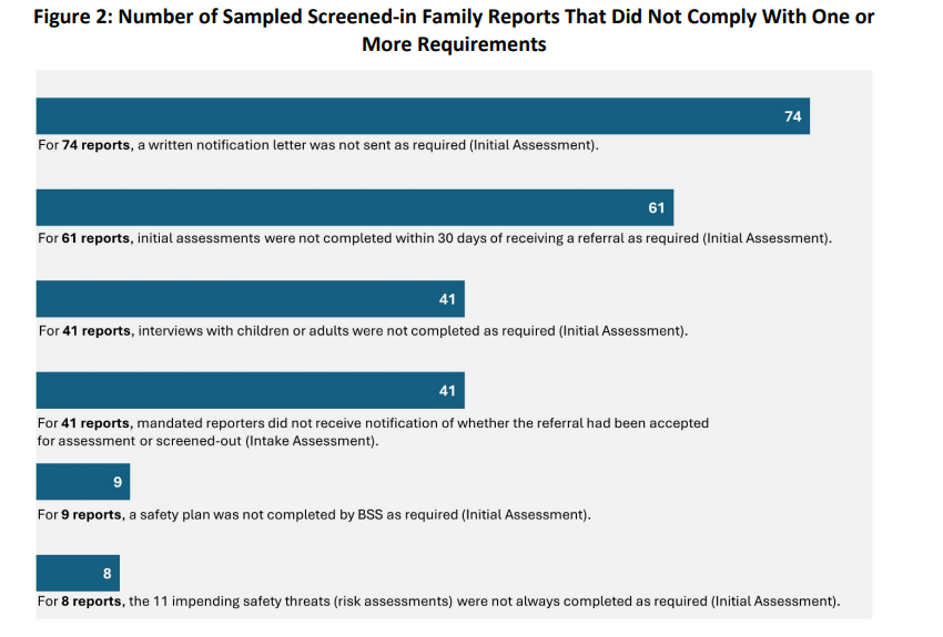 As the above graphic shows, caseworkers failed to send notification letters to involved parties when abuse is reported 74% of the time, failed to complete initial assessments within 30 days 61% of the time, interviews with children or adults were not completed as required 41% of the time, mandated reporters were not told whether abuse had been substantiated 41% of the time, a safety plan was not completed 9% of the time, and risk assessments were not completed as required 8% of the time.