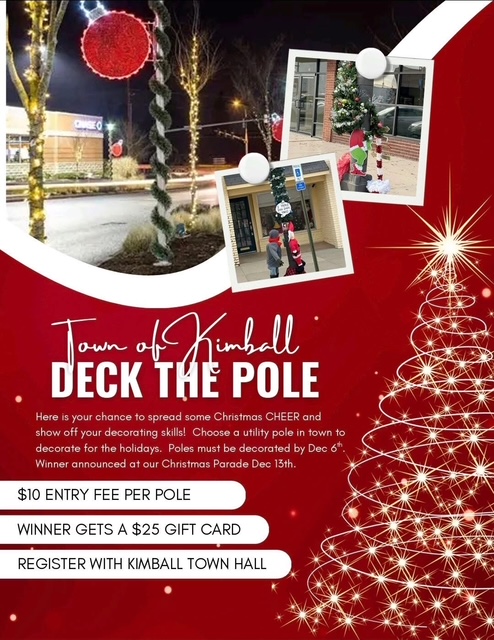 - The Town of Kimball is sponsoring their “Deck the Pole” decorating contest, now through December 13. This is your chance to show off those decorating chops! Choose a utility pole in town to decorate for the holidays. Poles must be decorated by December 6. The winner will be announced during the annual Christmas Parade on December 13. Entrants must register at Kimball Town Hall. Entry fee is $10 per pole, and the winner will receive a $25 gift card.