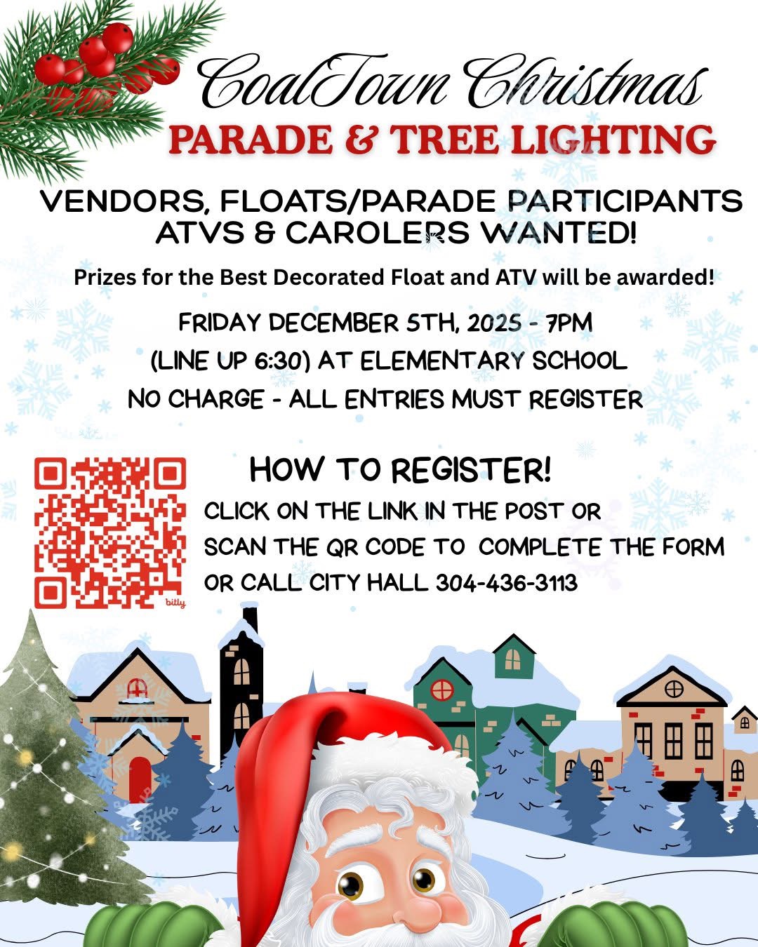 - The CoalTown Christmas Parade & Tree Lighting is scheduled for Friday, December 5, at 7 p.m., at Welch Elementary School. Parade line-up begins at 6:30. There is no charge for participation, but all entries are required to register by calling City Hall, at 304-436-3113.