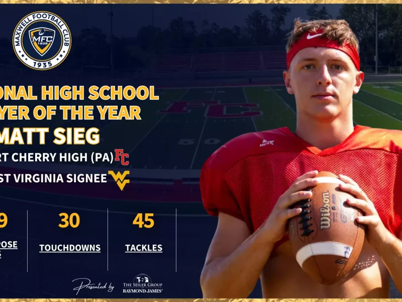 MORGANTOWN, W.Va. – Maxwell Football Club executive director Mark Wolpert announced that West Virginia University football signee Matt Sieg was named the 2025 National High School Player of the Year by the Maxwell Football Club, marking the 19th year that this honor will be presented at the Club’s National Awards.