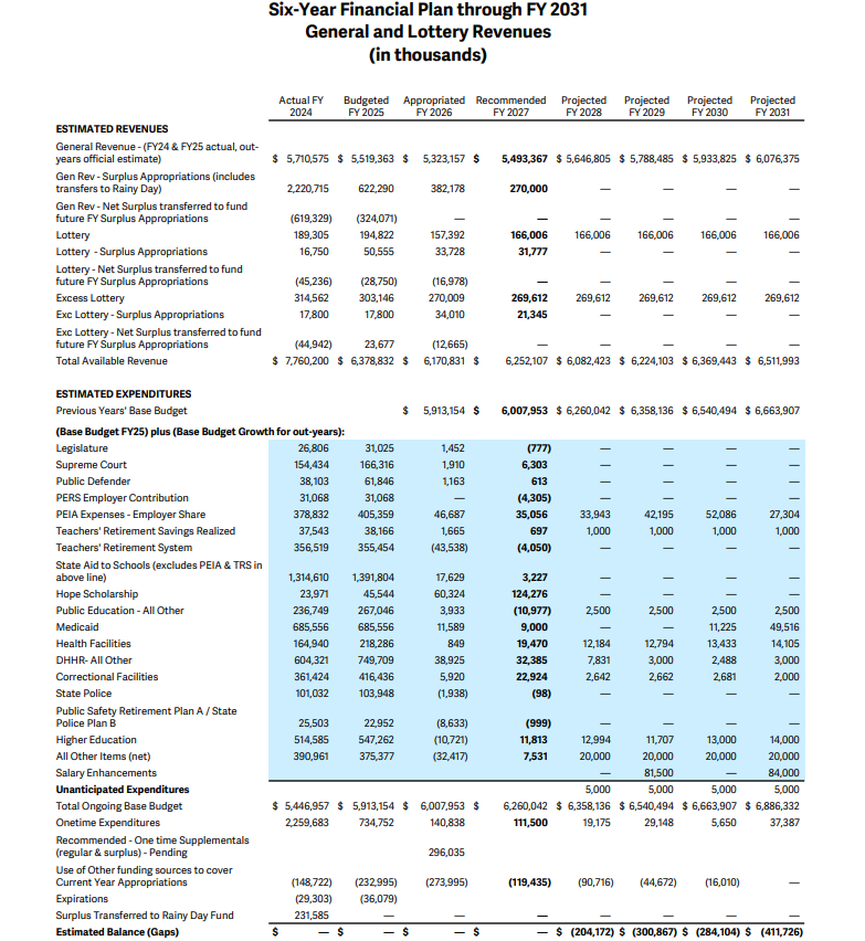 The six year plan for fiscal year 2027 shows state revenue in the amount of $6.1 million, while estimated expenditures total $6 million, McKown said, noting that the governor’s six year financial plan shows only general revenue, lottery and excess lottery funds.