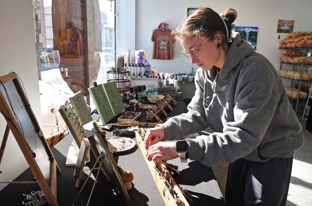 Beckley’s Downtown Market vendor Madison Yancey sets up her Twisted Willow jewelry at the market on Thursday. The store currently has 18 local vendors and weekend pop-ups.