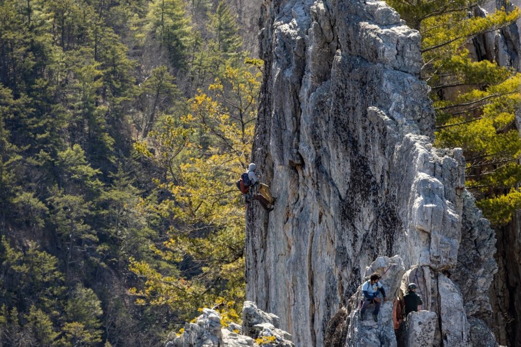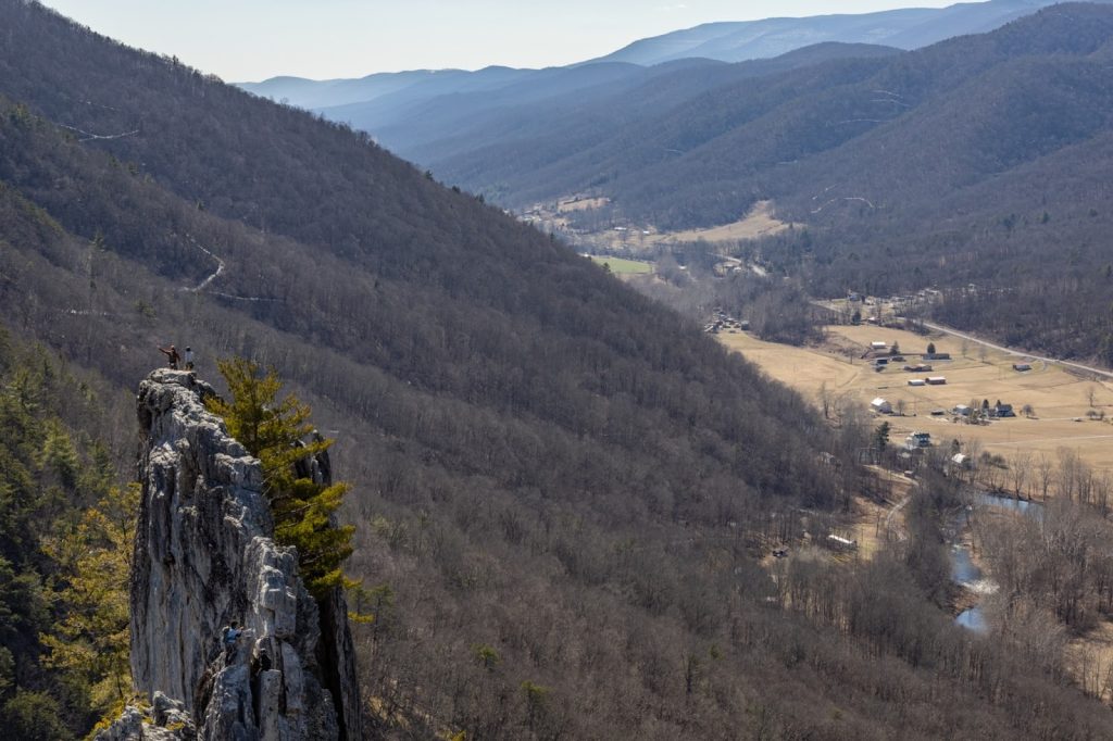 Climbers stand on the top of the outcrops of Seneca Rocks, overlooking the North Fork Valley below. Photo by Vanta Coda III for RealWV.