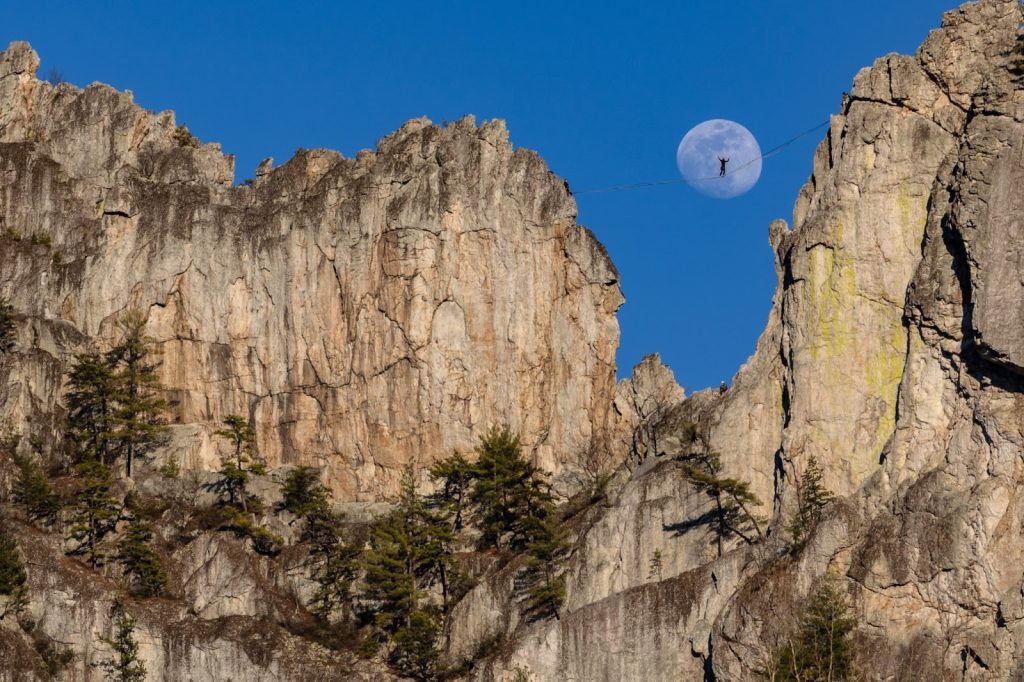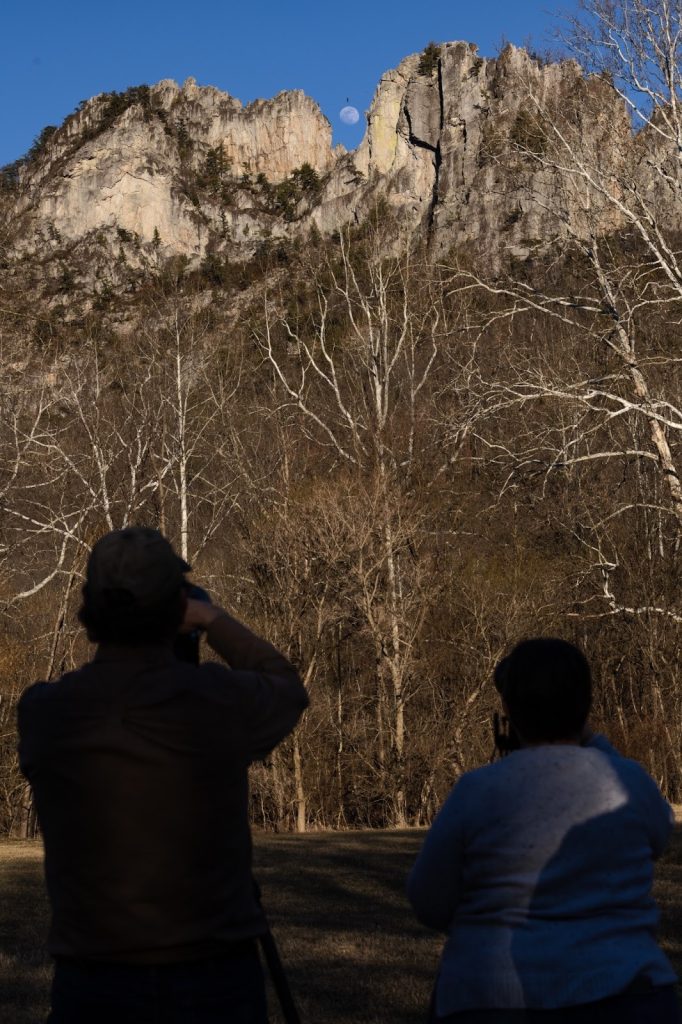 From the top of Seneca Rocks, the wind whips through the jagged, sawtooth-like blades of Tuscarora Sandstone that make up the picturesque crag. Within the blades of Seneca Rocks, a team of highliners from Fourth Moon Camp, led by Wade Desai, set up a highline between a gap in the sawtooth formation called the Gunsight Notch. On Feb. 28 and Mar. 1, the moon rose between the notch where some of the team walked across the highline in profile against the moon, visible from the Seneca Rocks Visitor Center hundreds of feet below, where a photo workshop led by Jesse Thornton and Dave Johnston set up to capture the shot.