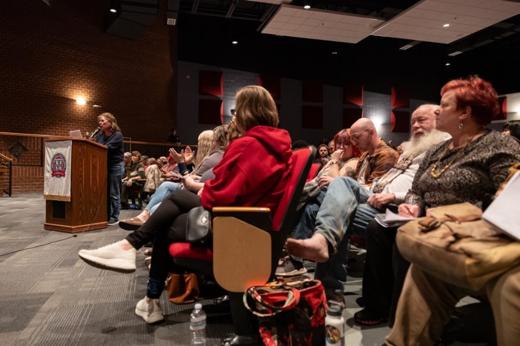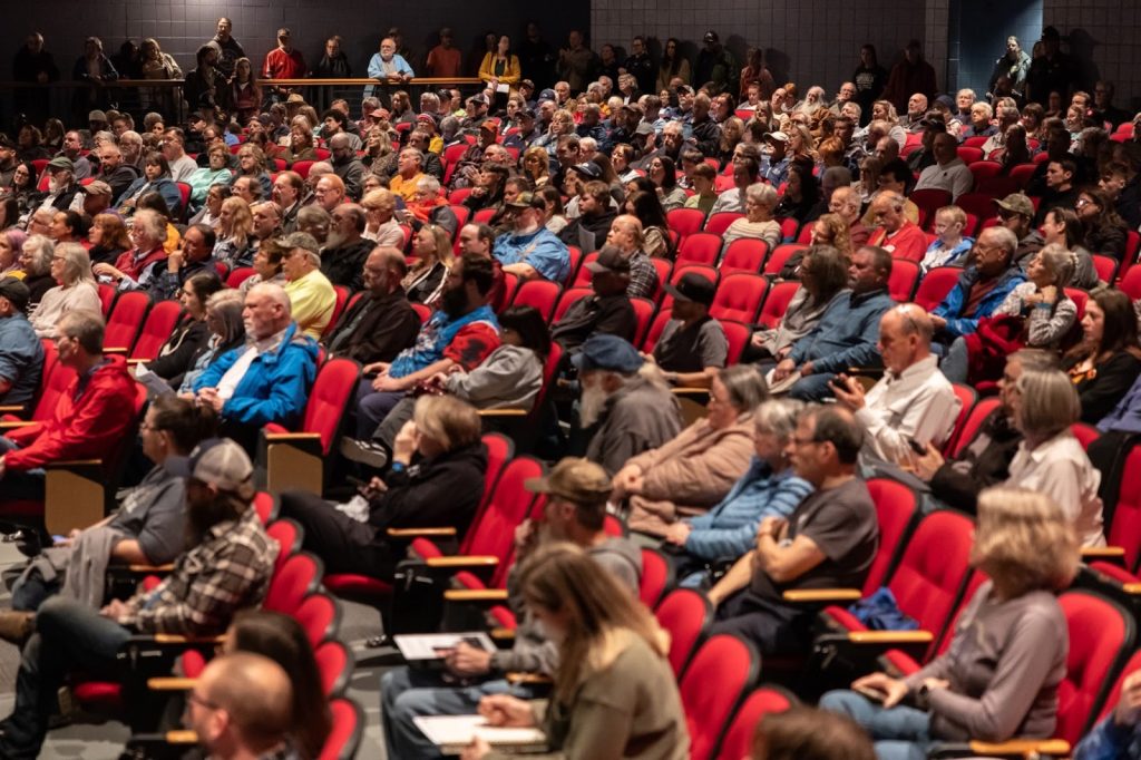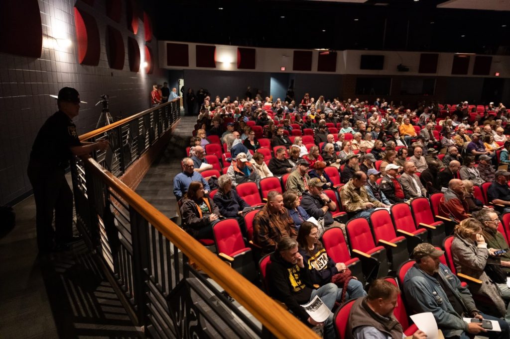 Concerned citizens sit in the Spring Mills High School Auditorium for the Berkeley Co. Commission town hall meeting about the proposed data center to be constructed in the township of Bedington, W.Va. Photo by RealWV.