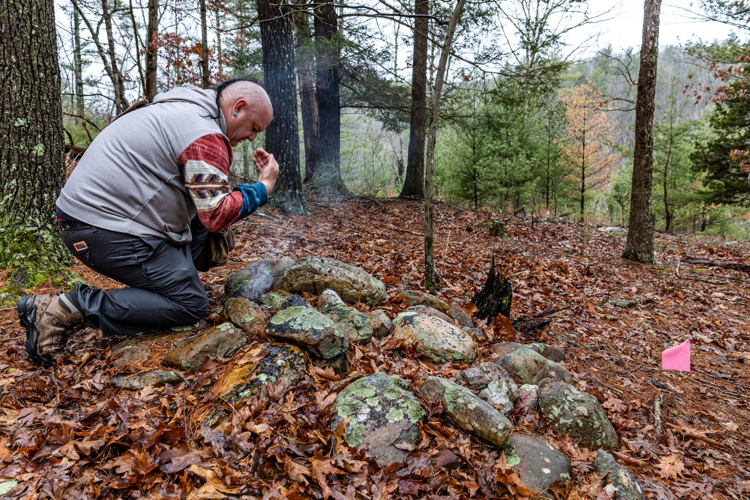 Matthew “Maasaw” Howard burns tobacco and sage at one of the mounds at the Talala (“woodpecker” in Cherokee) site in eastern West Virginia as an offering to those buried there. This particular site features 60 burial mounds arranged in rows, intricately spaced in linear bands up a hill. Due to debris and soil movement on this site, many of these mounds are only visible from above, so Howard and his team use flags to mark their locations.