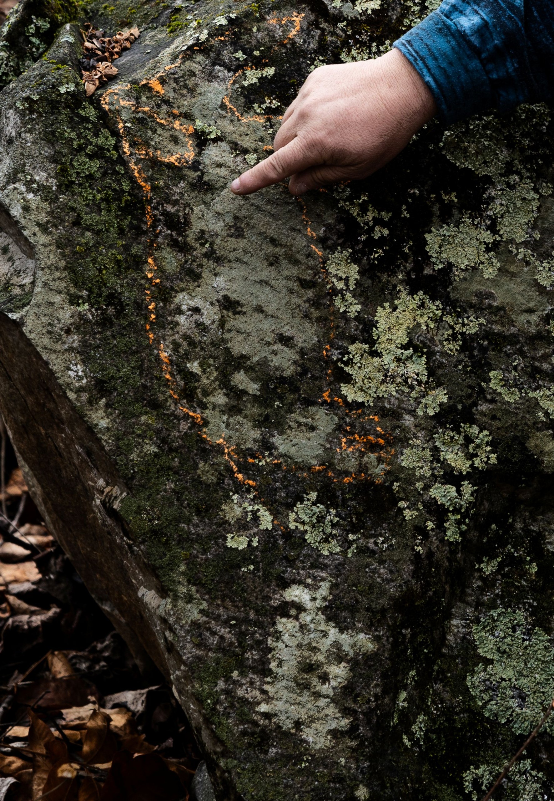 Steve Kitner, property owner of the site Yona (“bear” in Cherokee), places stone-carved figurines on a ledge of a sacred site. Rocks are placed in a spiral pattern from the crack in the limestone through which Kitner is reaching. Howard said the site is called a “split stone” and was used for religious purposes and believed to be a thin plane, or “portal” through which ancestors could enter thisworld and return to theirs.